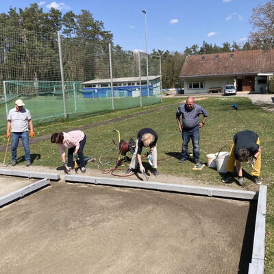 Nach einer langen regenlosen Zeit benötigten die Boulebahnen eine gründliche Wiederauffrischung. Die fleissigen Boulesenioren haben das Unkraut und die Blätter entfernt und die harten und unebenen Bahnen mit Hacken und Rechen aufgelockert. Die Bahnen wurden anschließend wieder geglättet und reichlich gewässert. Nun stehen sie allen Boulegruppen für die neue Saison wieder zur Verfügung.
